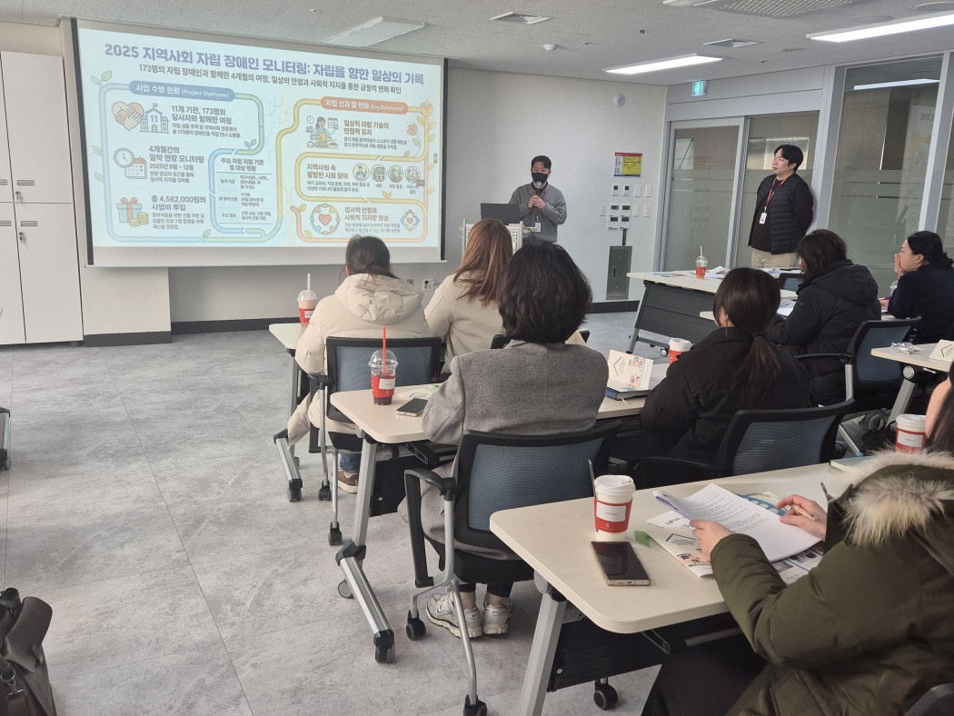2026년 지역사회 자립 장애인 모니터링 사업 안내 부관리자 0 51 01.29 09:53 - 일시: 2026. 1. 28.(수) 17:00~17:30 - 장소: 대구광역시장애인희망드림센터 2층 - 내용: 모니터링 사업 안내 및 협조요청